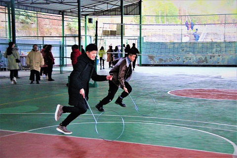 党总支副书记冉明出席活动并发表讲话,并希望同学们在保证安全情况下团结协作,赛出风格、赛出水平。随后裁判讲解比赛为积分制,个人所得名次积分统计在班级总积分中,并组织各班派代表抽签分组,比赛正式开始。跳绳比赛形式为班级赛,计时两分钟。共16个班级分为三组进行。只见同学们身手敏捷,一根根飞舞的绳子,一队队腾空跳跃的身影让人眼花缭乱。随着一声哨响,滚铁环比赛也已经开始,有的同学从容不迫,控制着铁环;有的同学虽有些踉跄,但也不甘示弱,大家各显身手,欢声雷动。镜头转到踢毽子比赛,五彩的毽球在空中飘逸的飞舞,尽管大家的水平参差不齐,但每一位参赛的同学都使出浑身解数,赢得了观众一次又一次的欢呼。
