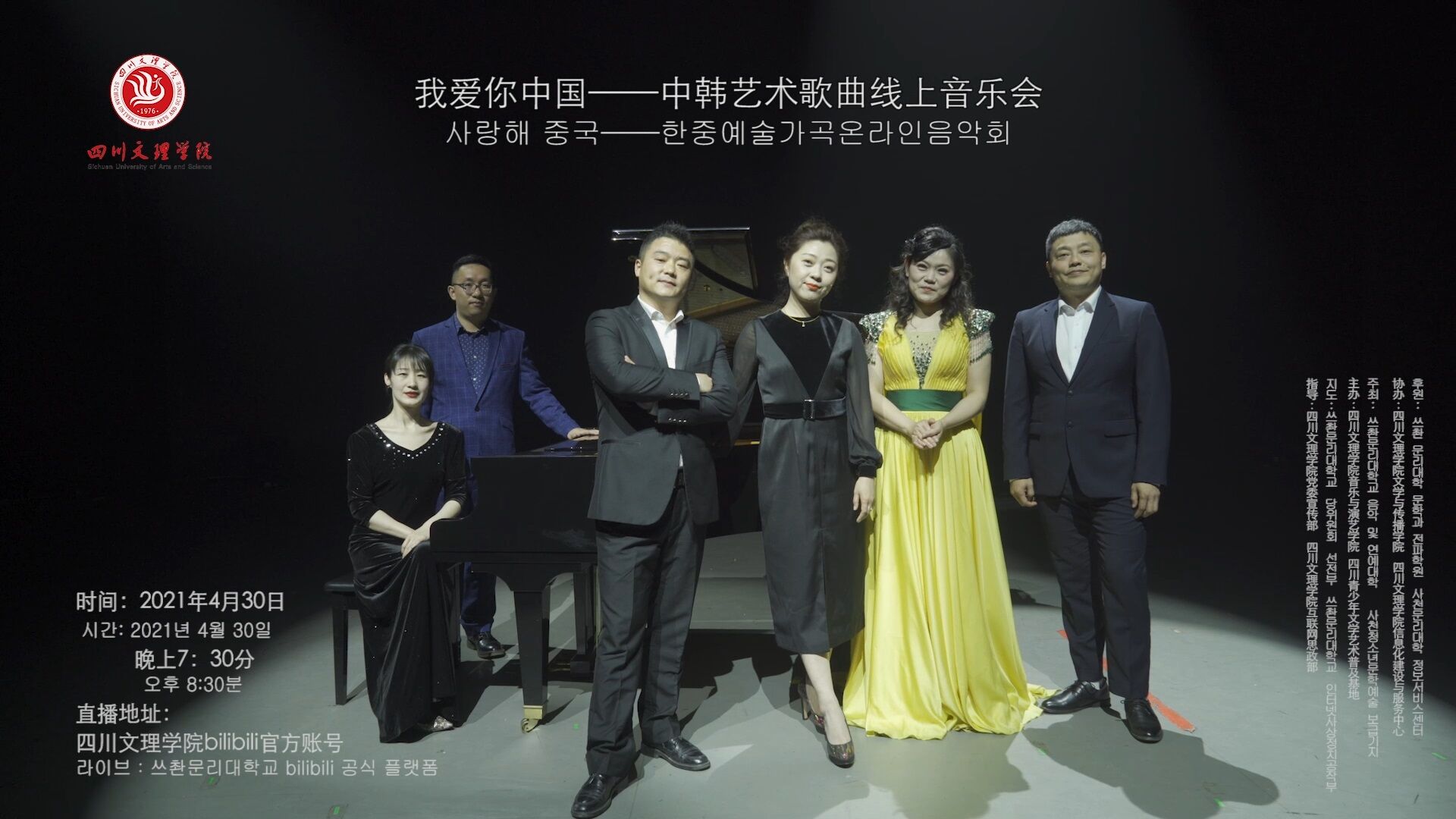 4月30日晚7点30分,为庆祝中国共产党建党100周年,音乐与演艺学院教师何凤先、李玥欣、高畅、姜元明、杜佳倪和朱华等六位老师结合自身的专业特点,举行了“我爱你中国——中韩艺术歌曲线上音乐会”。