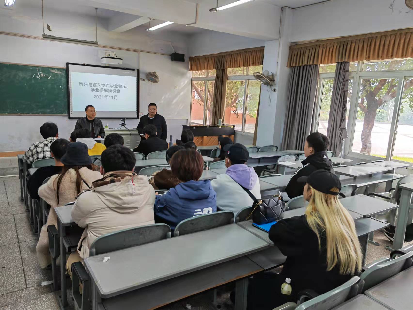 按照学校工作要求,音乐与演艺学院在11月17日中午12:30在音1022教室举行了学业警示、学业提醒座谈会,因疫情和实习等原因,该场座谈会在线上与线下结合进行,会议由副院长冉明主持,党支部副书记董怀军、相关班级辅导员、学业警示、学业提醒的所有学生和个别学生家长参加了这次会议。