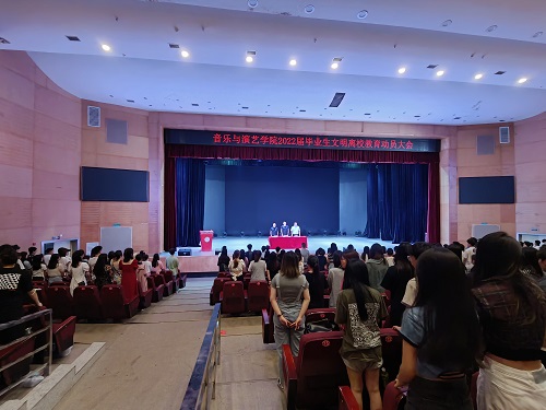 音乐与演艺学院于2022年6月5日晚上7:00在音乐厅开展以“享受校园美好时光 文明校园情谊永续”为主题的2022届毕业生文明离校动员大会。本次大会由董怀军副书记主持,参加人员有学院领导、学工办人员、毕业班辅导员和全体毕业生。
