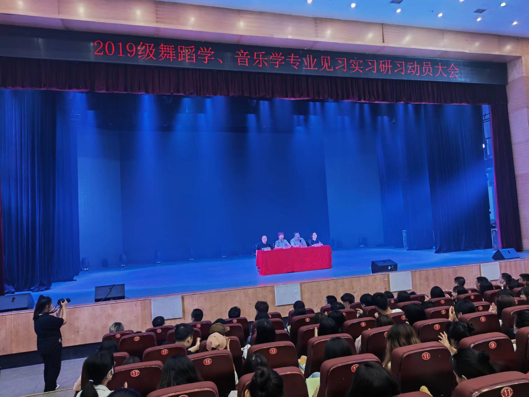 6月9日晚7点,音乐与演艺学院在音乐演播厅召开了2019级舞蹈学、音乐学专业见习实习研习动员大会,学院党总支书记阮碧辉、副书记董怀军、副院长冉明出席了本次大会,实践教学指导教师张静秋、2019级各带班辅导员教师和舞蹈学、音乐学专业全体学生参会,会议由副书记董怀军主持。