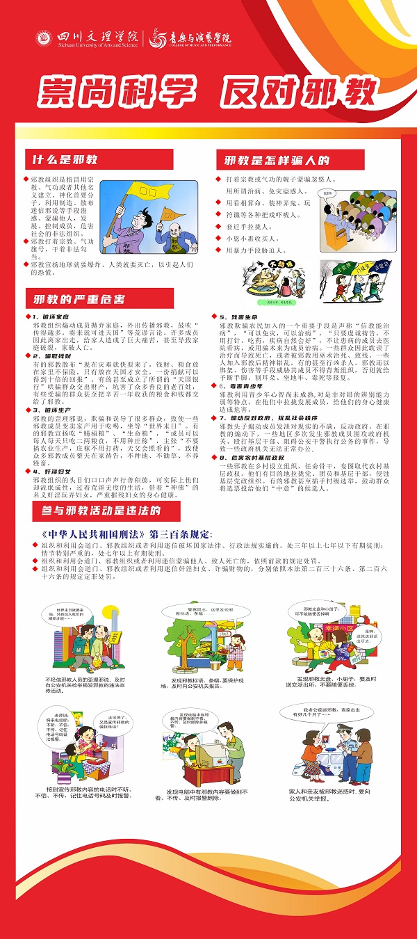 为建设和谐校园,维护社会稳定,净化教育系统,音乐与演艺学院做了反邪教展板宣传,让每个学生充分了解反邪教类知识,提高反邪教意识,要持续深入开展反邪教警示教育,让同学们切实远离邪教危害,努力营造和谐平安稳定的校园。
